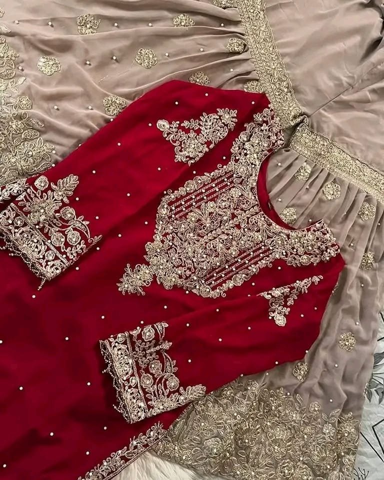 ই ড্রেস সেটটি ৩ পিস নিয়ে তৈরি। উপরের অংশটি লাল রঙের, যেখানে সুন্দর সূচিকর্ম ও স্টোন ওয়ার্ক করা হয়েছে, যা পুরো ডিজাইনকে ঝলমলে ও দৃষ্টিনন্দন করে তোলে। নিচের অংশটি গ্রে রঙের জর্জেট বা নেটের ফ্লেয়ার প্যান্ট, যা সূচিকর্ম দ্বারা সজ্জিত। সাথে একই ধরনের গ্রে রঙের দোপাট্টা রয়েছে, যা পুরো সাজকে আরও অভিজাত ও সুন্দর করে তোলে। পার্টি, বিয়ে বা বিশেষ অনুষ্ঠানের জন্য একদম উপযুক্ত।