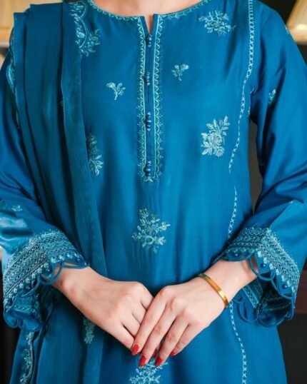 Teal Blue Embroidered Lawn 3-Piece Suit with Chiffon Dupatta