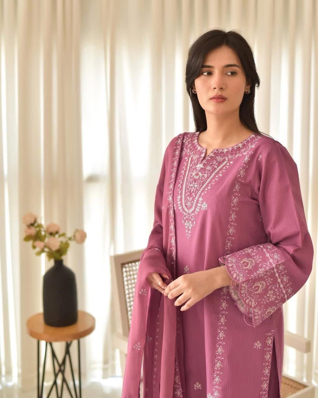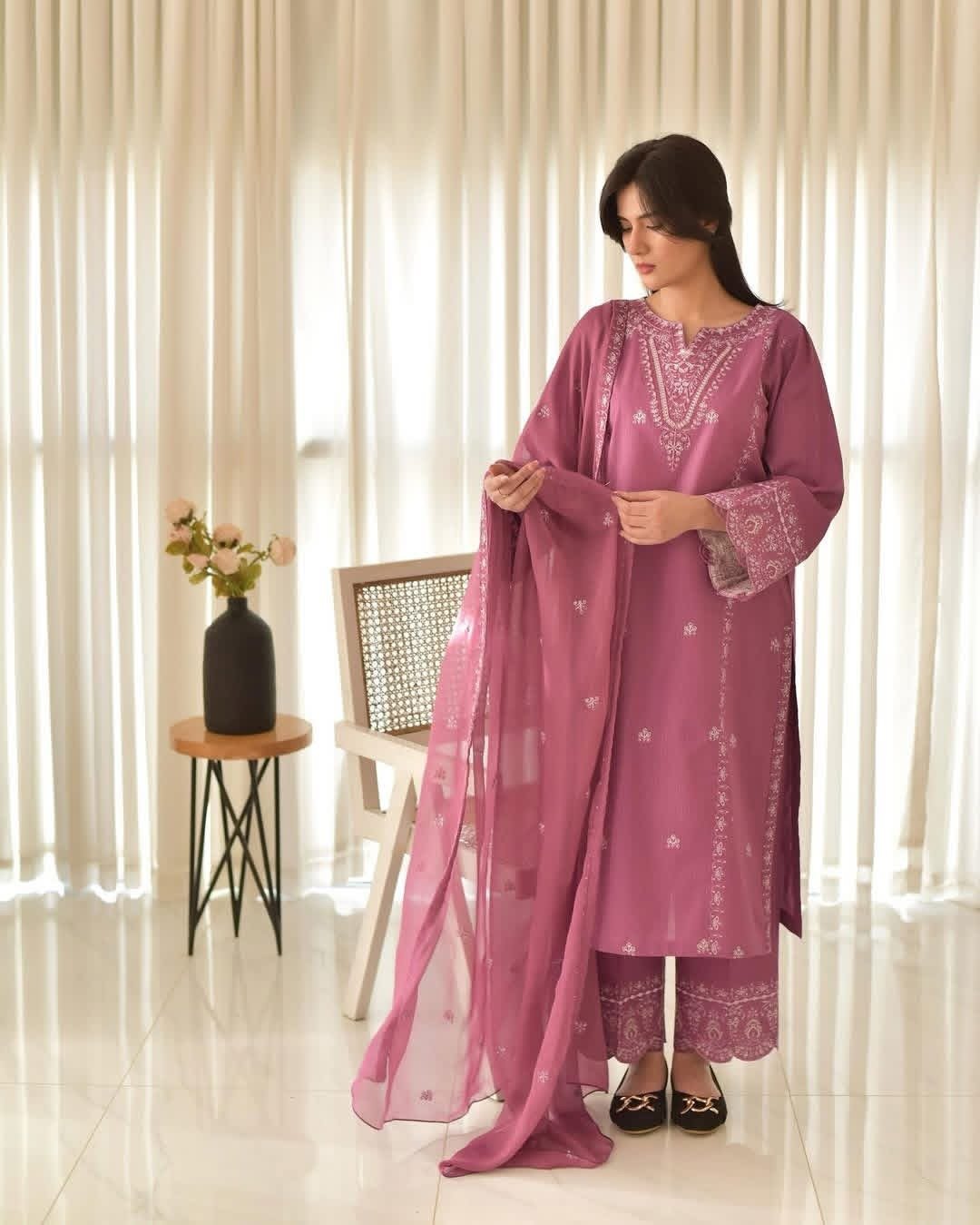 Luxury Embroidered 3-Piece Dress Set – Deep Magenta Edition